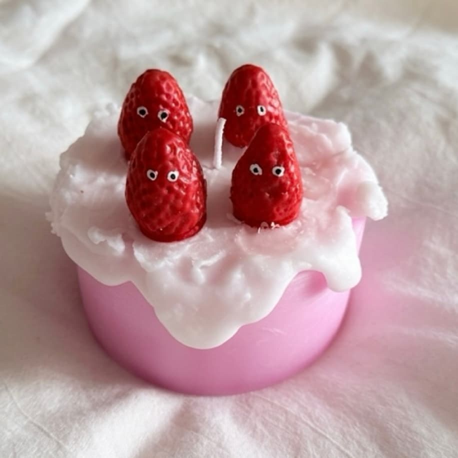 Pembe pasta formunda el yapımı mum. Üzerinde sevimli gözlü çilek figürleri ve krema detaylarıyla süslenmiştir. Doğum günü ve özel günler için tatlı bir hediye seçeneği.